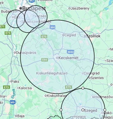 Kecskemét és 50 km-es körzete, és Szeged 30 km-es körzete